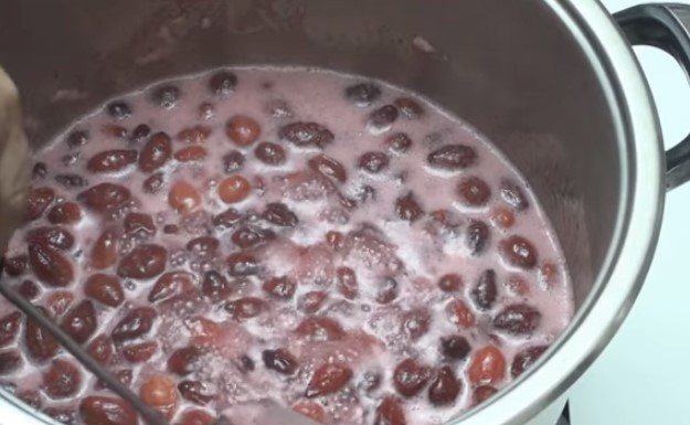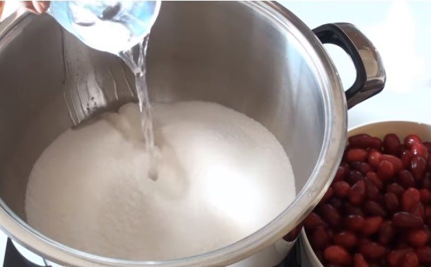 Когда косточка удаляется, выделяется много сока, поэтому его нужно потом добавить к плодам. Кизил засыпается сахаром и стоит в таком виде примерно 3 часа. Этого времени вполне хватает, чтобы плоды пустили сок, а сахар практически растворился в нем. В емкость с содержимым следует добавить количество воды, указанное в рецепте.