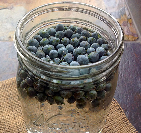 - Ягоды можжевельника поместить в стеклянную емкость и помять деревянной палочкой.