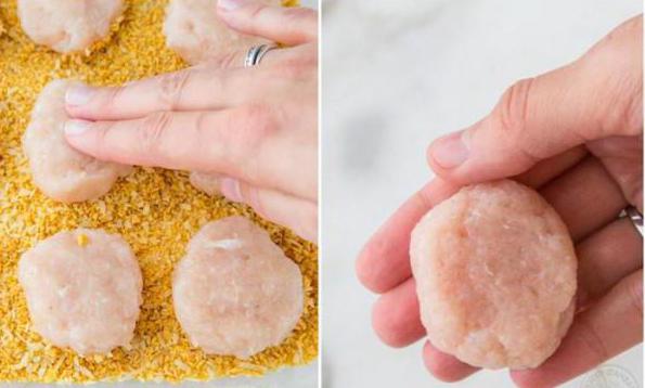из куриного мяса, сформированный в виде небольших лепешек, так же можно использовать для наггетсов.