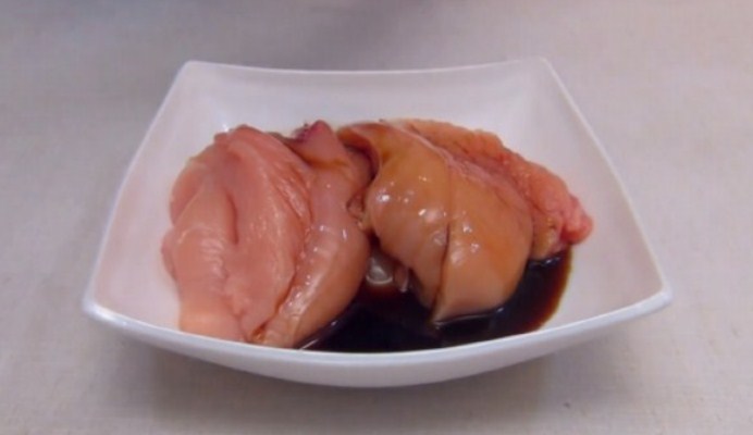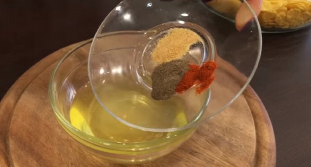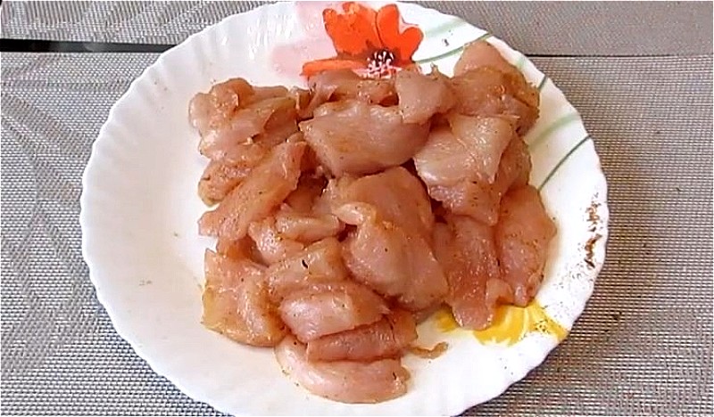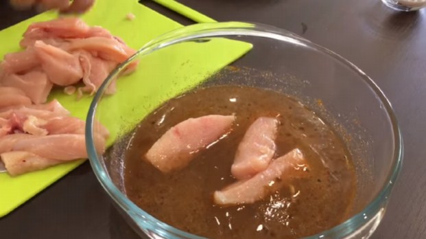 1. Филе порезать, замариновать в соусе на некоторое время. Можно усложнить блюдо: в качестве маринада взять ту приправу или соус, вкус которой имеют чипсы. Например, с чипсами со вкусом шашлыка использовать кавказский шашлычный соус для заготовки филе.