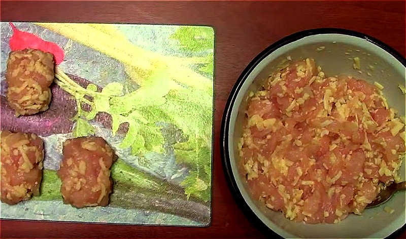 1. Куриное филе помойте и нарежьте на мелкие кусочки. Добавьте туда тертый сыр и посолите. Равномерно перемешайте до однородной массы. Из получившегося фарша сформируйте небольшие котлетки одинакового размера.