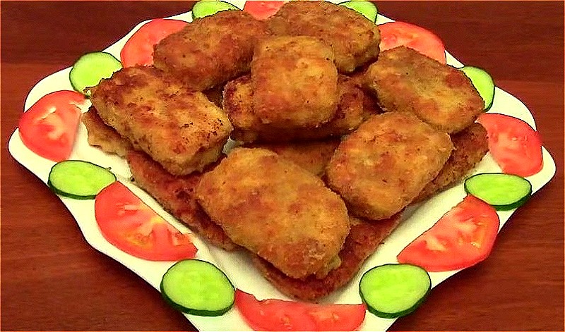 Немного необычный для наггетсов рецепт. Здесь они готовятся по принципу рубленных куриных котлет. Очень интересная вариация. Благодаря сыру, мясные изделия получаются сочными внутри и невероятно вкусными.
