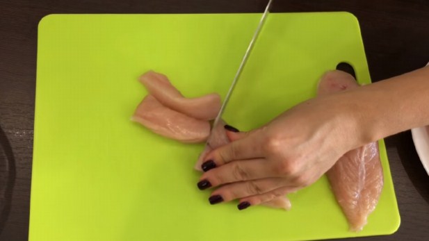Сегодня самым распространенным рецептом того, как приготовить наггетсы в домашних условиях, считается использование цельного куриного филе. Его необходимо промыть и тщательно высушить. После нарезать равными кусочками средней величины. Обязательно это нужно делать поперек волокон.