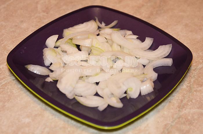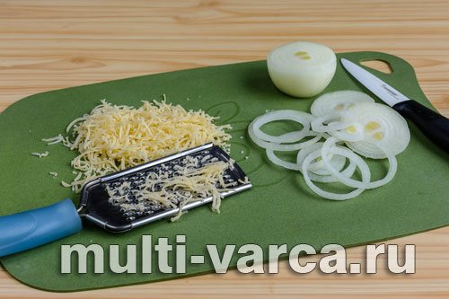 3. Тем временем режем кольцами или полукольцами луковицу. И натираем кусочек сыра.