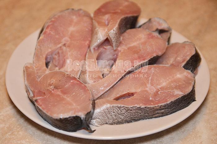 Рыбу нарезаю кусочками толщиной по 1,5 см.