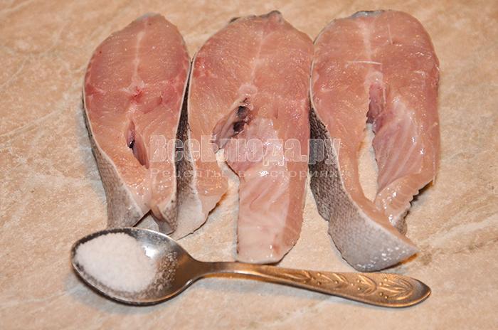 2. Тушки разрежьте на порционные кусочки и взвесьте. Посолите из расчета 1 ст.л. соли без горки на 1 кг рыбы. Тщательно перемешайте, чтобы кусочки просолились равномерно. Оставьте минут на 10-15.
