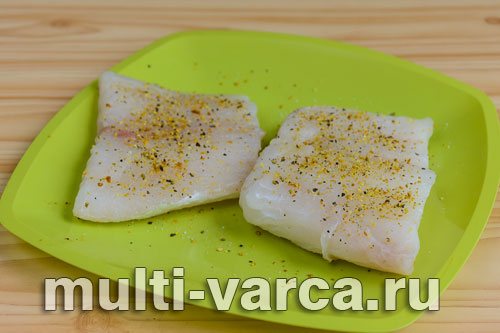 2. На рыбные куски с каждой стороны брызгаем соком половинки лимона либо раствором лимонной кислоты. Также с каждой стороны посыпаем солью и лимонным перцем. Оставляем филе минут на 20.