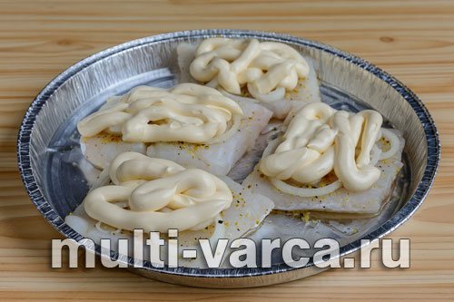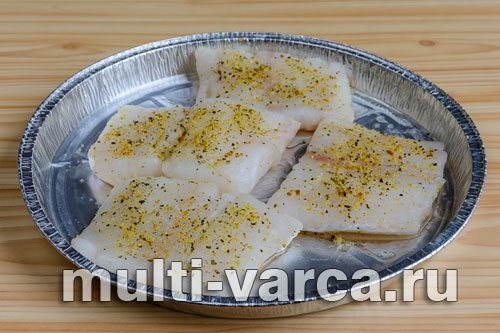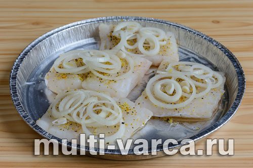 - Сверху разложите рыбное филе, предварительно подсоленное и замаринованное в перце и лимонном соке.