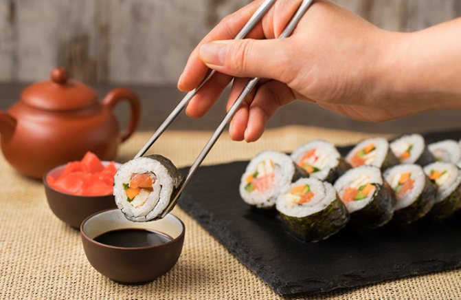 Суши чаще всего едят с соусом васаби, который имеет антисептические свойства. Рис содержит клетчатку, которая просто необходима для хорошего пищеварения.